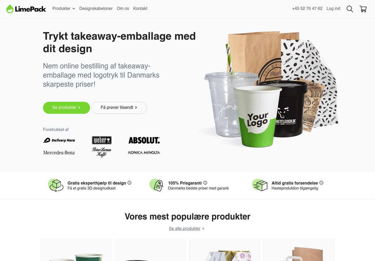 Hos Limepack finder du alt i to go emballage med tryk. Søger papkrus med logo tryk, isbægre med logo tryk eller måske smoothie krus og tilhørende papirsugerør? Bare rolig vi kan med garanti hjælpe dig. Som specialister i engangsemballage med tryk, sætter en ære i at hjælpe dig og dit brand. Hos Limepack får du altid gratis standard fragt og som noget unikt har vi tilmed også gratis designhjælp. Hop online på limepack.dk og se udvalget!