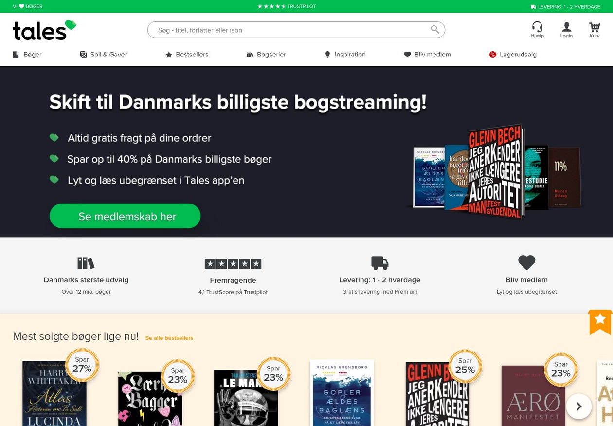 tales.dk er Danmarks bedste online boghandel for dig der elsker gode bøger. Vi tilbyder billige bøger, således du får muligheden for flere gode læseoplevelser. Ved at købe dine bøger online, kan du i ro og mag vælge en god bog uden at skulle stå i kø i butikken. Vi har et kæmpe stort udvalg af danske og engelske bøger, e-bøger og lydbøger og tilbyder de nyeste titler og bestsellers.