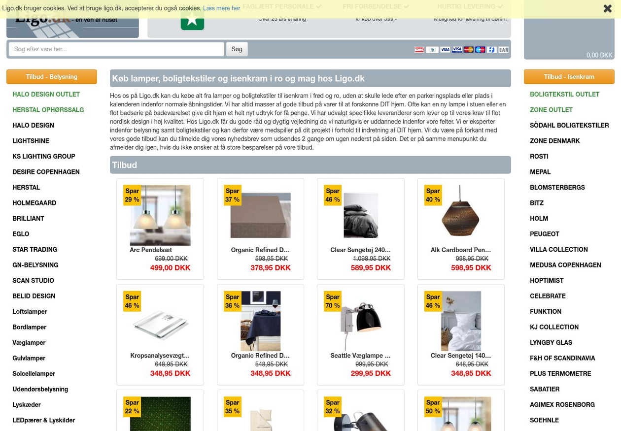 Ligo.dk er en webshop med et stort udvalg indenfor kategorierne belysning og isenkram. Vi sælger bl.a. Holmegaard, Herstal og Halo Tech lamper, men også Södahl, Rösti Mepal og Piet Hein isenkram. Når du bestiller på vores shop har du enten mulighed for at afhente din ordre eller modtage din pakke med GLS.
