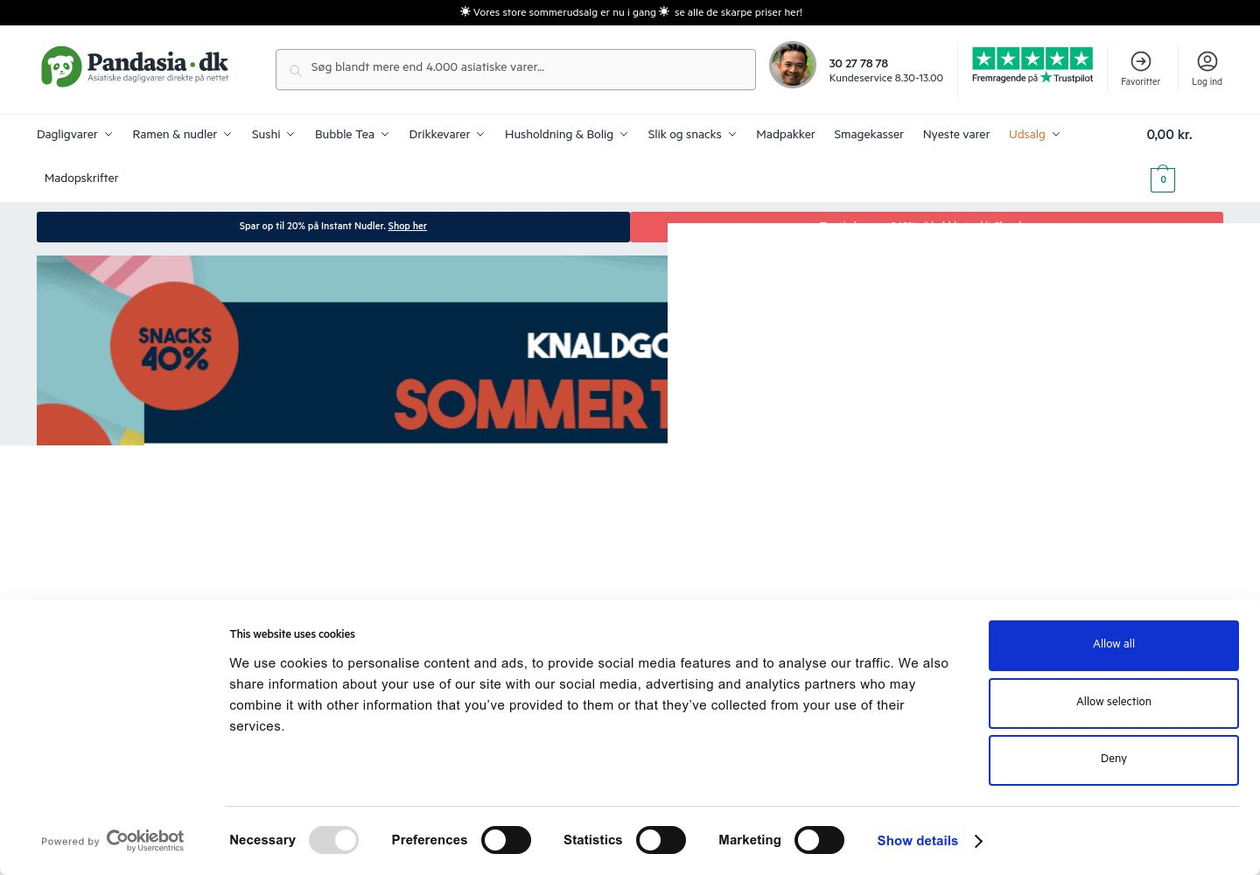 Velkommen til Pandasia.dk – dit ultimative asiatiske supermarked online! Vi er dedikerede til at bringe autentiske asiatiske smagsoplevelser direkte til dit hjem. Uanset om du er en passioneret kok eller bare elsker at udforske forskellige kulturer gennem mad, har vi alt, hvad du har brug for. Vores sortiment omfatter et bredt udvalg af kvalitetsvarer, lige fra eksotiske krydderier og saucer til friske grøntsager, ris, nudler, skønhedsprodukter og meget mere. Vi stræber efter at sikre, at vores kunder får autentiske produkter af højeste kvalitet, der gør det nemt at tilberede autentiske asiatiske retter derhjemme. Med vores brugervenlige webshop kan du nemt browse, vælge og bestille dine favoritvarer med et par klik. Vi tilbyder også hurtig og pålidelig levering, så du kan nyde den ægte smag af Asien uden besvær. Vores passion for asiatiske kulturer og køkken driver os til at levere den bedste oplevelse for vores kunder. Så tag et virtuelt besøg hos os på Pandasia.dk og lad os hjælpe dig med at opdage skønheden ved asiatisk madkunst.